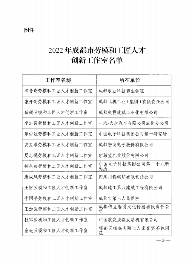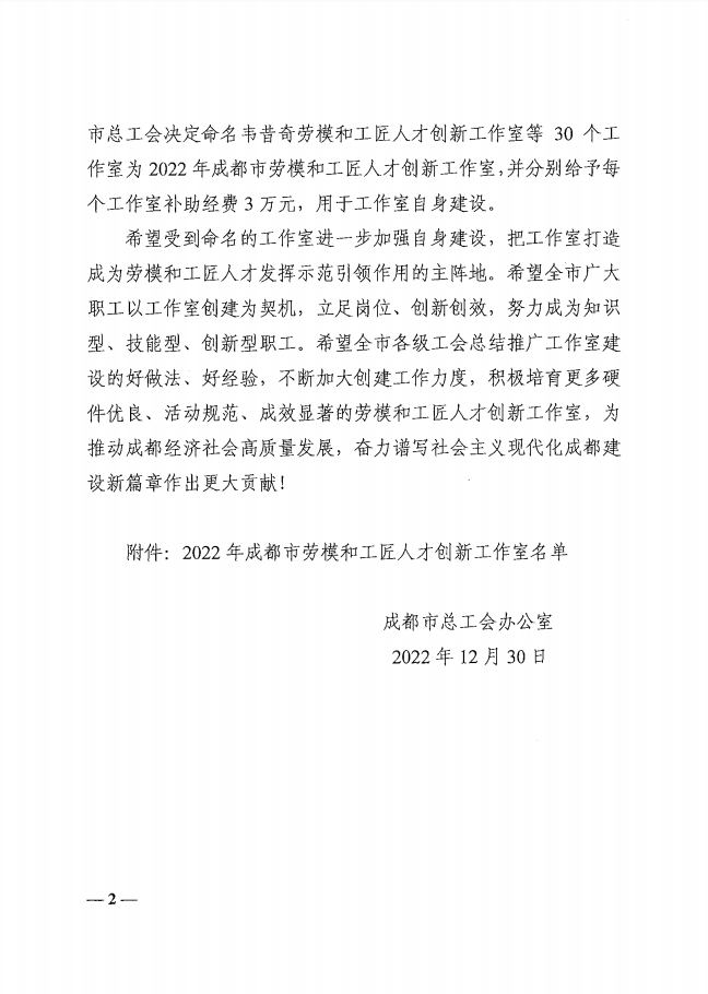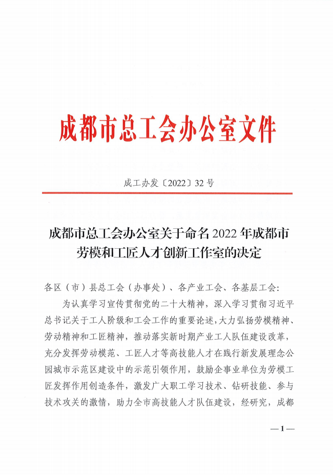 2022年12月30日,经成都市总工会发文决定,我司付尚波劳模和工匠人才创新工作室正式由区级晋升市级!
