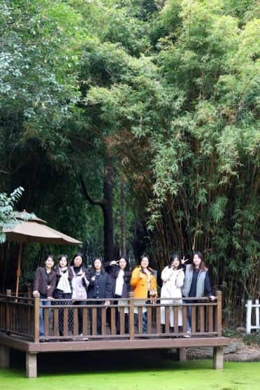 作为成都的标志性建筑,九天楼自然是打卡的重头戏,她们在古色古香的楼阁前留下了集体大合影。随后,漫步80亩竹林秘境,仿佛闯入一片绿野仙踪。