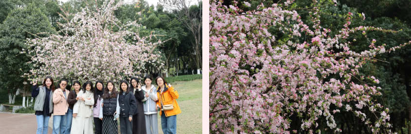 在海棠园里,玉兰与海棠正艳,粉白相间的玉兰高挂枝头,娇艳的海棠随风摇曳。她们纷纷掏出手机,定格春日色彩。